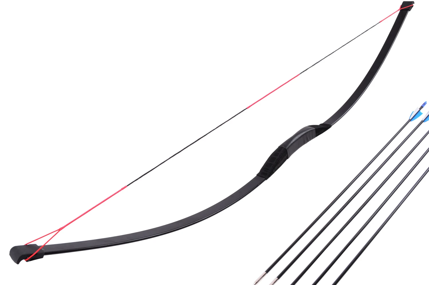 Arc chinois traditionnel et ses cinq flèches, fabriqué à la main par des artisans. Modèle milieu de gamme avec une tension peu élevée, conviendra parfaitement aux débutants.