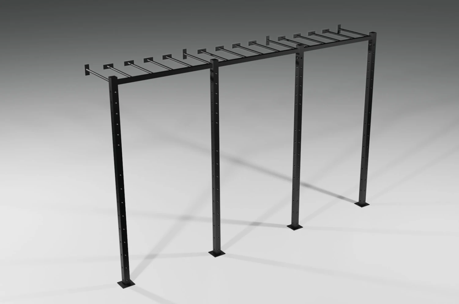 Cette cage Monkey bars (échelle horizontale) se fixe directement sur un mur par vis spit et autorise ainsi un gain de place tout en mettant à profit une surface murale. Conçue pour s’entrainer à traverser longueur à la force des bras en avançant barre aprés barre. L’objectif est de renforcer la puissance de préhension, et de muscler le haut du corps (travail complet) de façon ludique.