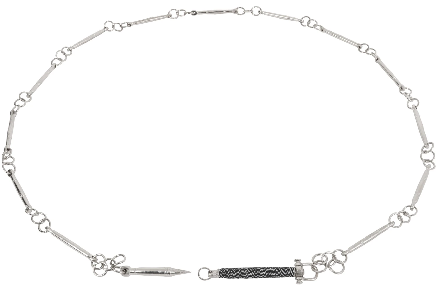 Chaîne composée de sections articulées, d’une pointe et d’une poignée. Les sections sont rattachées entre-elles par trois anneaux métalliques fermés par une soudure. Tous les élements de la chaîne sont en métal. Le nombre de sections ne prend pas en compte la poignée et la pointe.