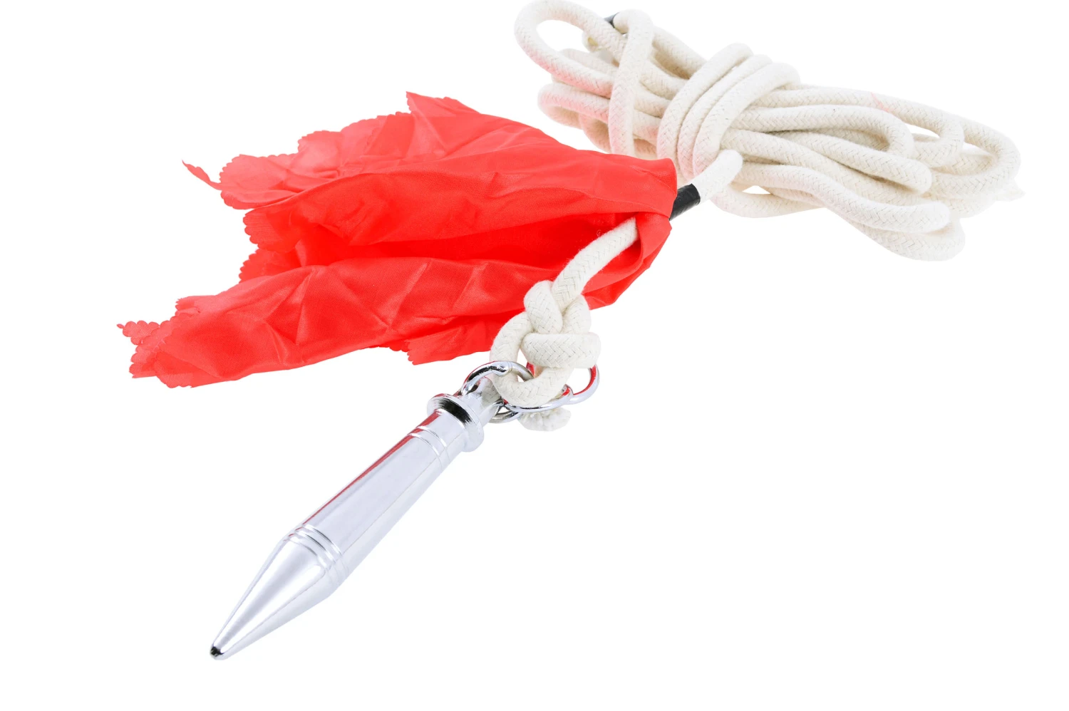 Projectile en métal, de forme droite, d’une taille totale de 13 cm et d’un poids d’environ 250. La corde pèse 110 g, pour un poids total de 360 g Relié à une corde épaisse en coton tressé, de 3,50m environ, par un anneau.
