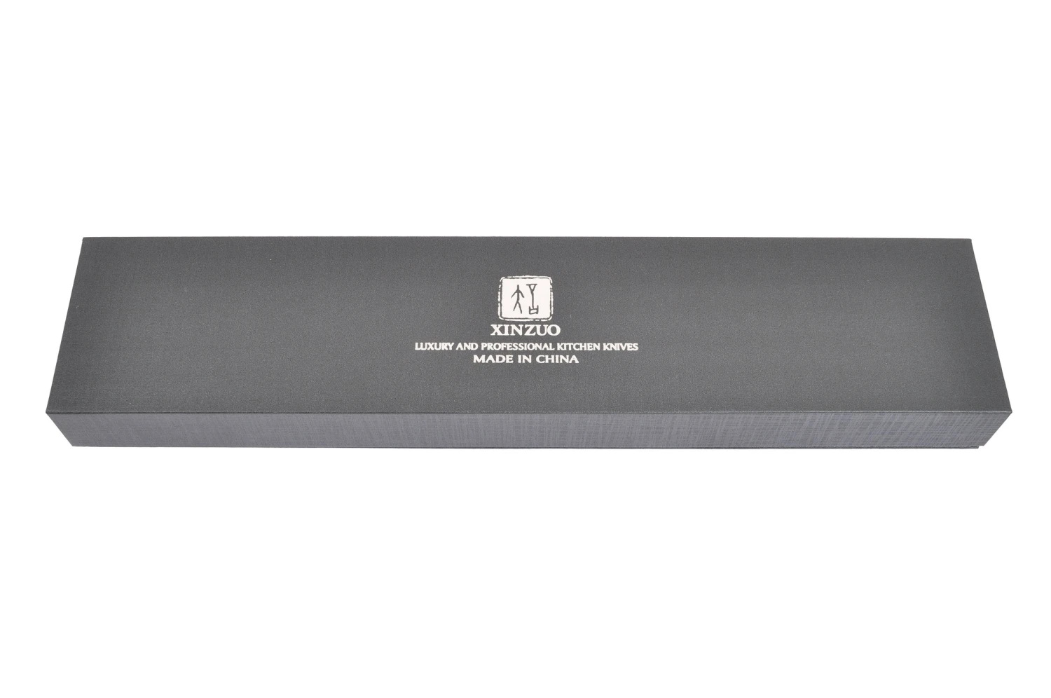 Couteaux de cuisine haut de gamme, en acier feuilletĂ© forgĂ© (acier damas ou damascus) : une couche d’acier centrale en 10Cr15Mov (acier dur pour le fil de la lame), entourĂ©e de chaque cĂ´tĂ© par 67 couches d’acier pliĂ©es en forge (feuilletĂ©). On peut voir les nervures du feuilletage sur la lame, ainsi que des reflets colorĂ©s grâce Ă la prĂ©sence de cobalt dans l’alliage. La lame est très tranchante tout en Ă©tant très rĂ©sistante (duretĂ© 60+-2 HRC). Manche en rĂ©sine moulĂ©e haute pression pour une soliditĂ© parfaite.