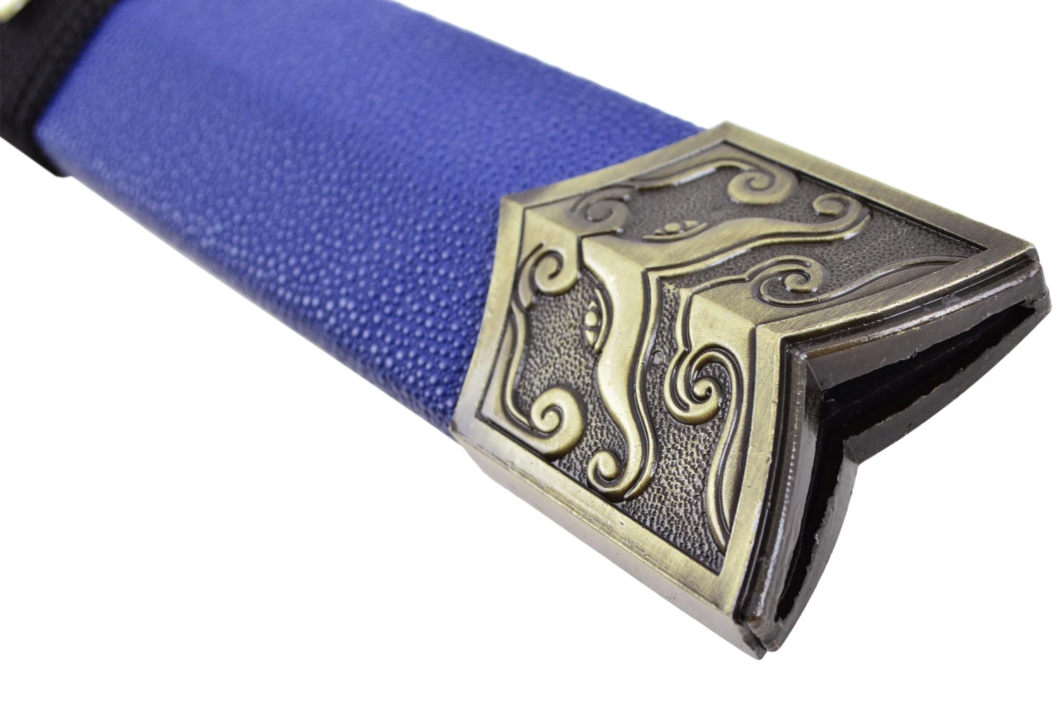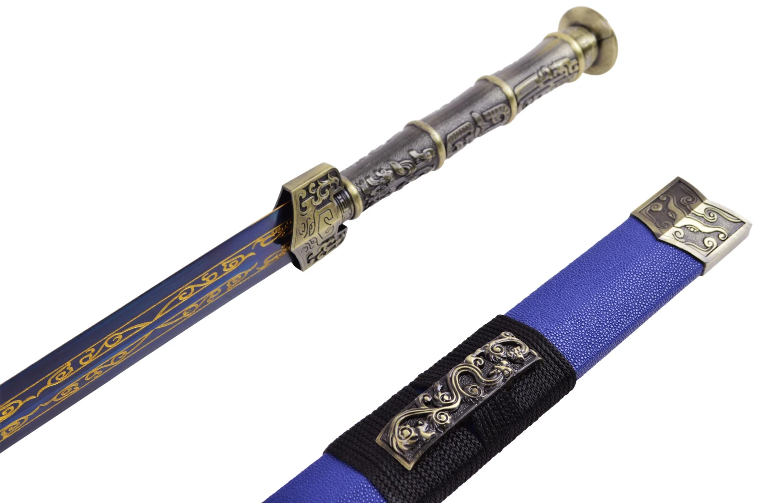 Épée Han avec Fourreau bleu effet « Peau de Requin » et une lame noire avec motif doré.