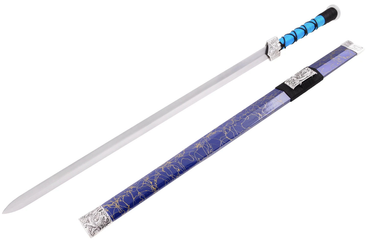 Épée avec un fourreau laqué bleu au motif doré.