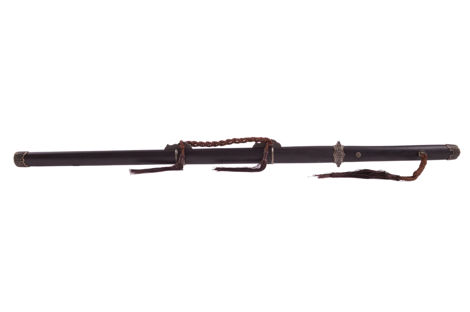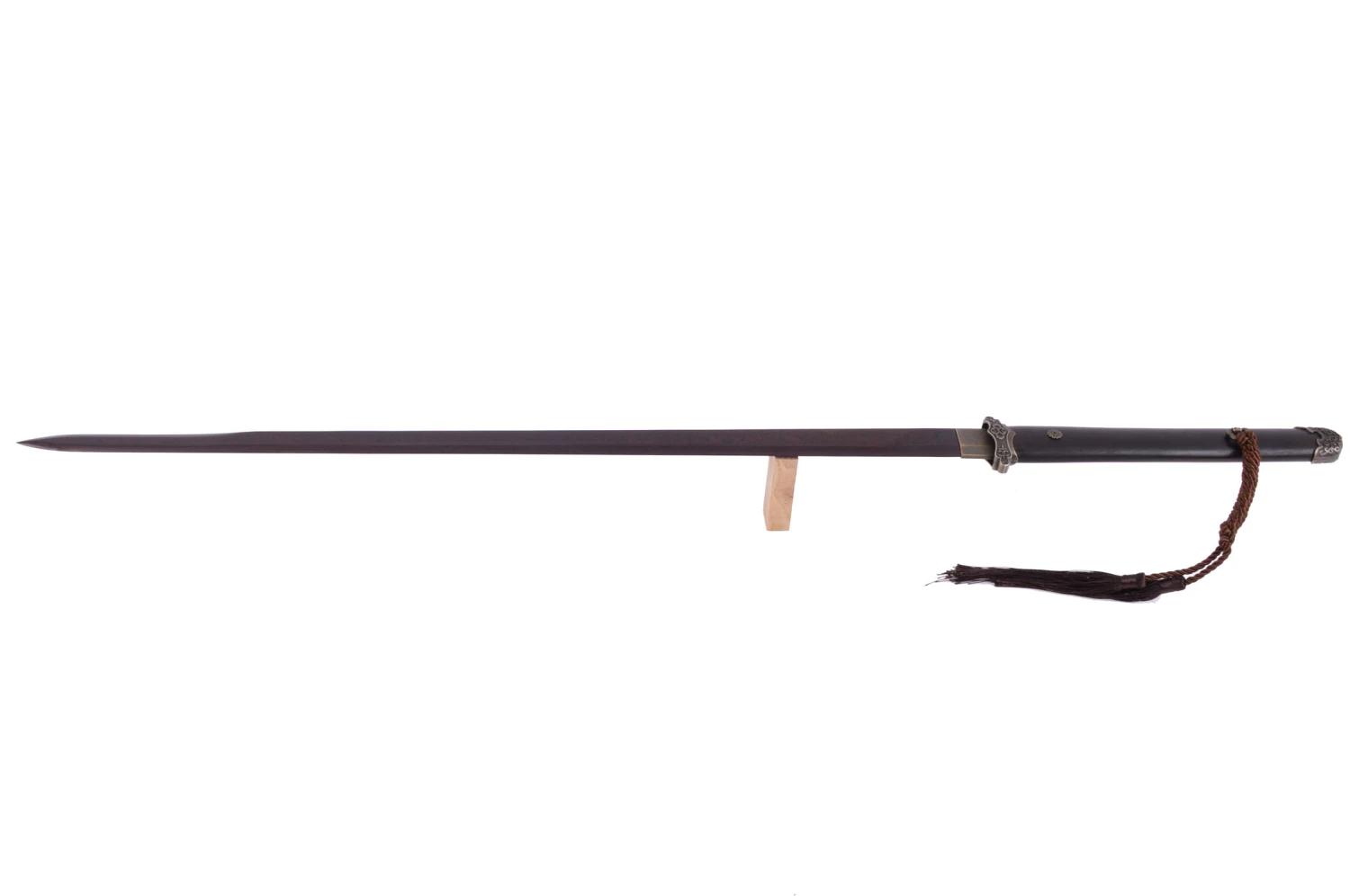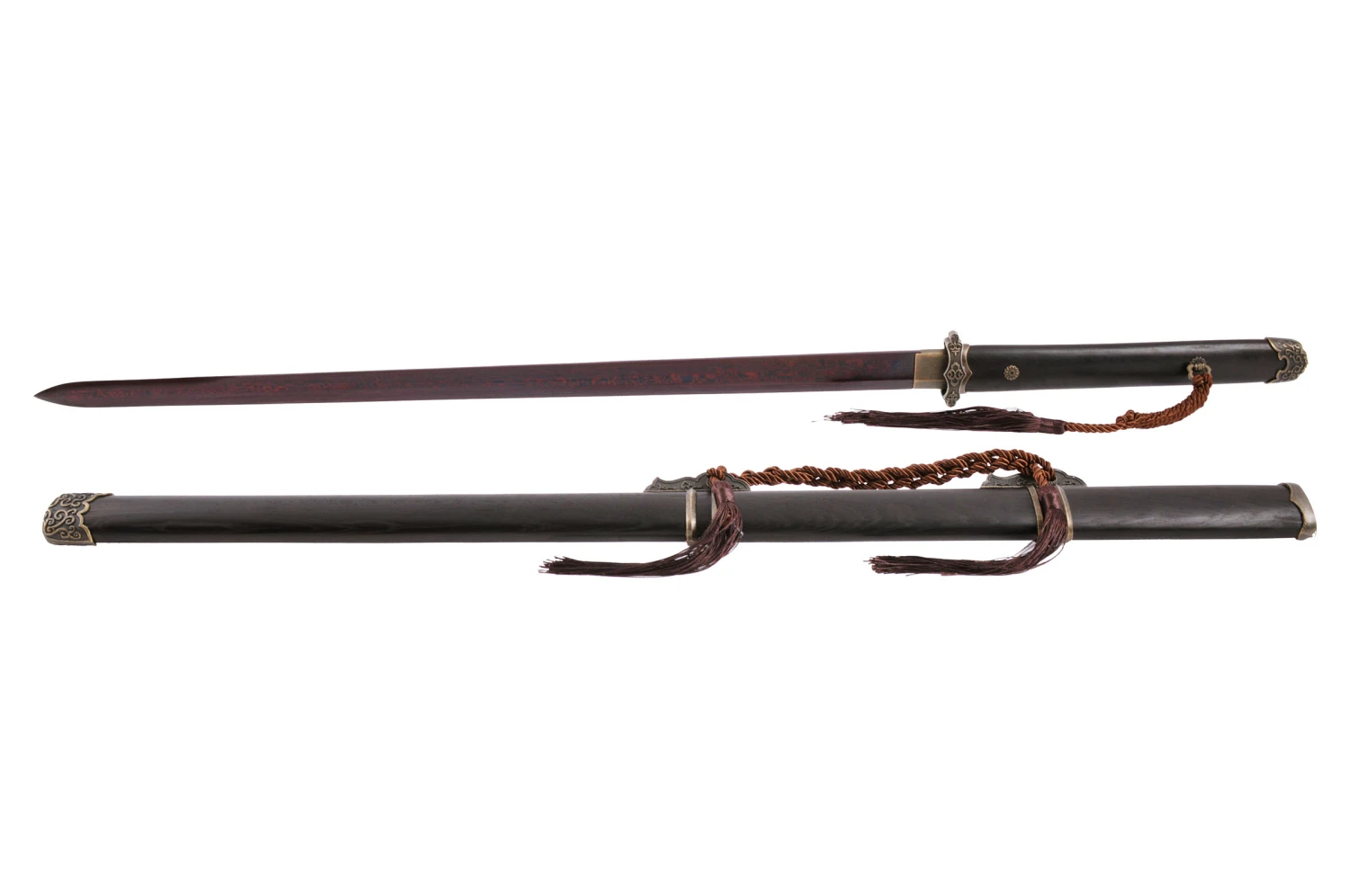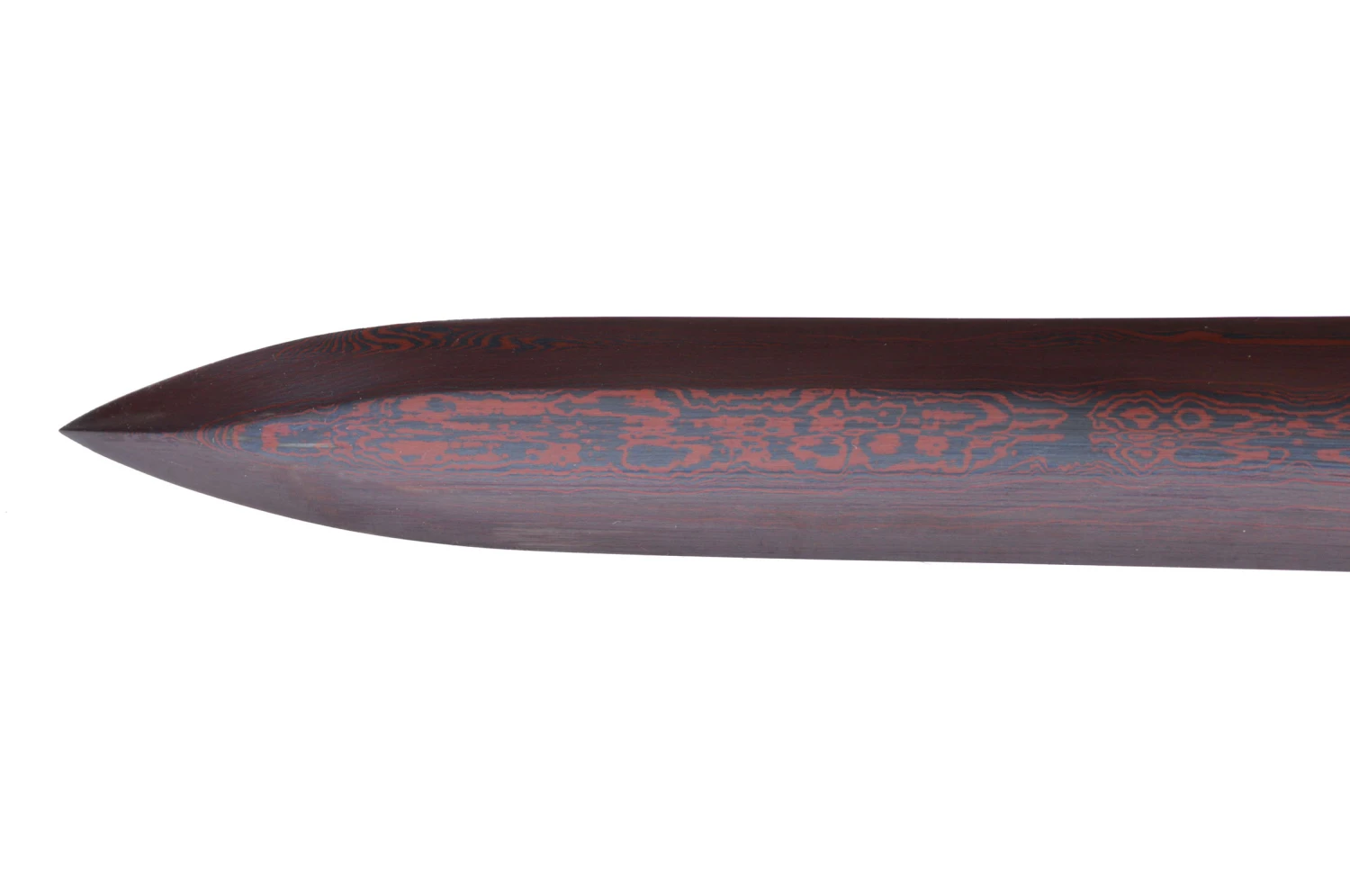 Epée de la forge LongHu, avec lame en acier manganèse peint en noir aux nervures rouges qui reproduit un effet acier feuilleté.