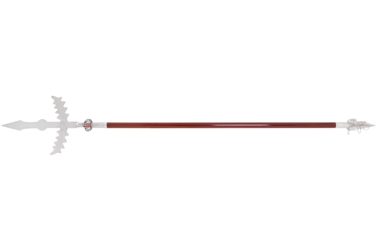 La fourche à dents de loup est une arme plutôt rare et assez exceptionnelle… Composée de deux branches avec les « dents » et d’une pointe. Les parties métalliques sont en acier chromé, et le bâton en bois verni.