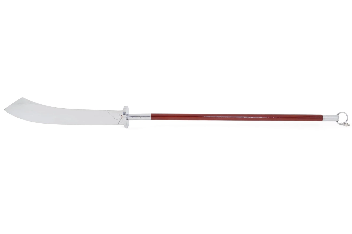 Cette hallebarde possède une longue lame flexible décorée d’un dragon et un manche laqué bordeaux orné d’anneaux ornementaux à son extrémité pour ajouter un côté esthétique et musical à l’arme.