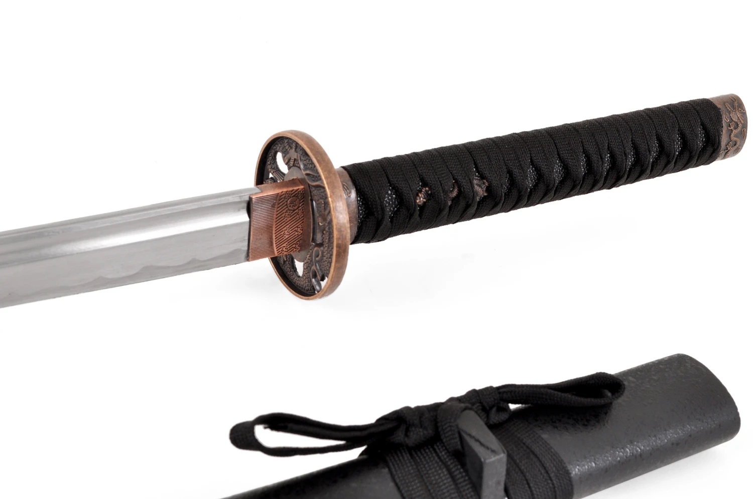 Ce katana possède une lame à gorge aiguisée, un manche au tressage noir, une garde (Tsuba) en Cuivre décoré de dragons et un magnifique fourreau (Saya) en bois.