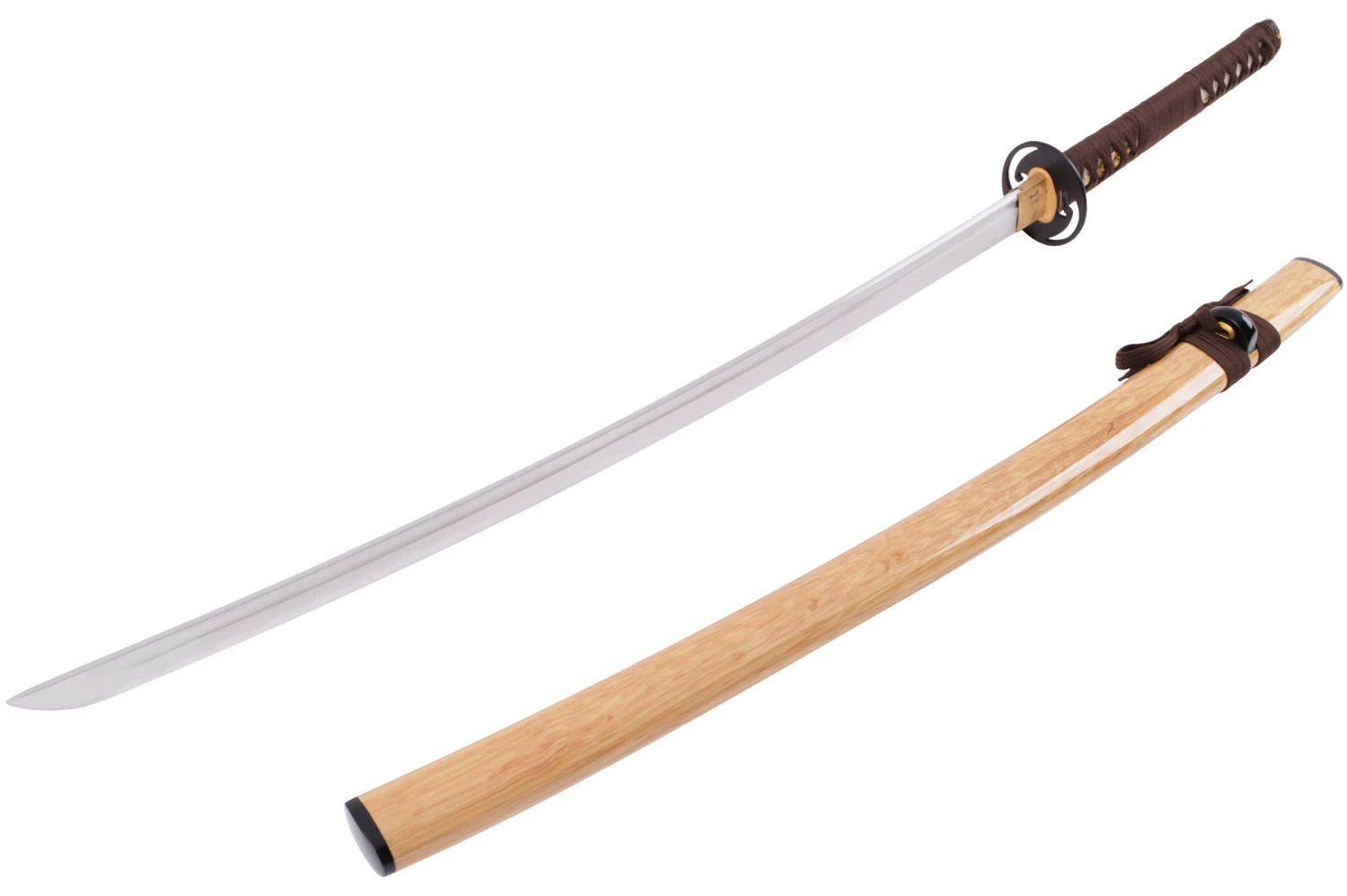Ce katana fabriqué en une seule pièce (Construction Full Tang) possède une lame à gorge aiguisée Maru trempe à l’argile, un manche au tressage marron, une garde (Tsuba) en acier décoré et un magnifique fourreau (Saya) en bois naturel verni.