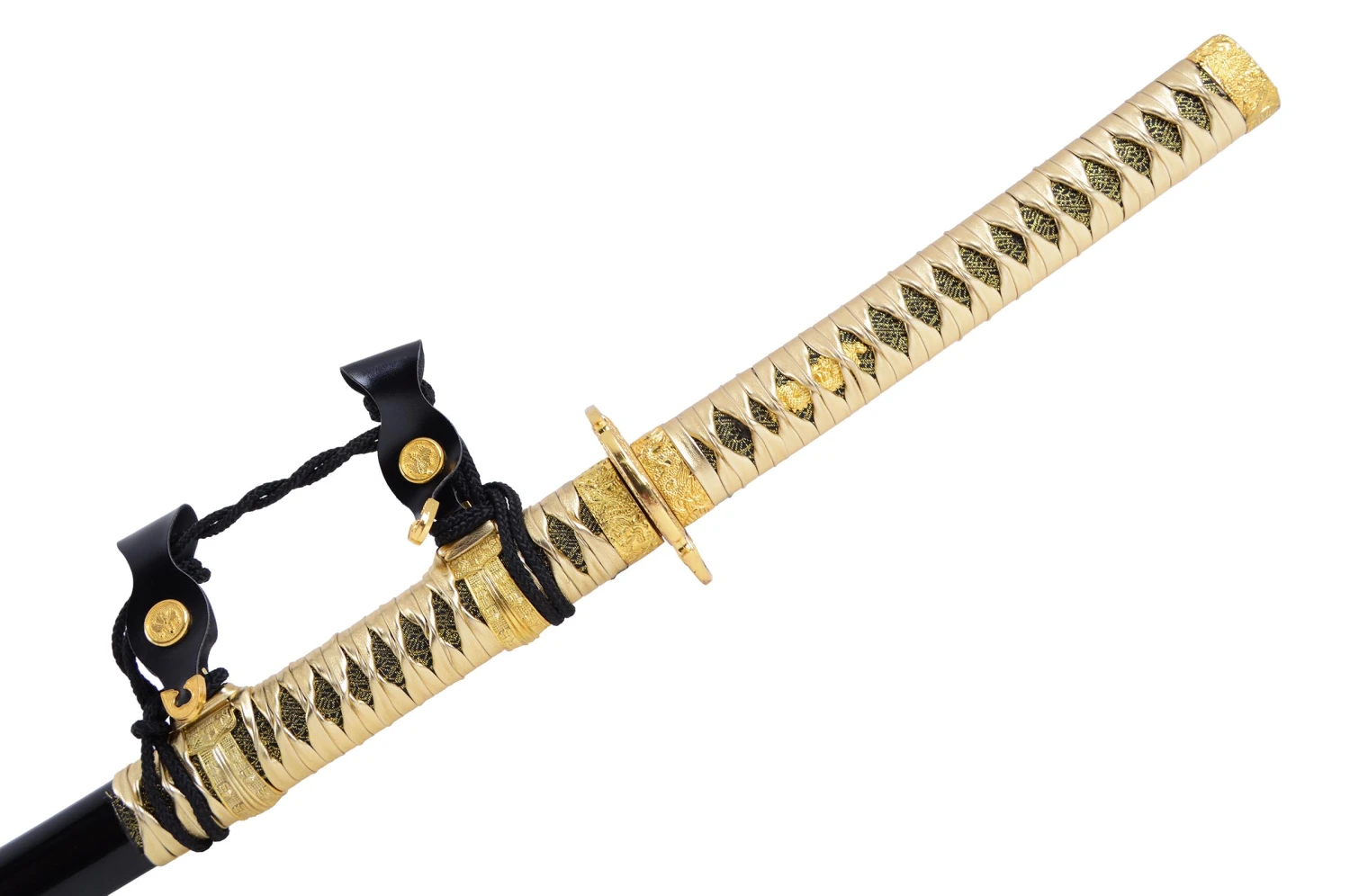Ce Tachi à lame aiguisée possède un manche tressé noir et or, orné en intérieur d’un Komainu (Lion gardien issu de la culture japonaise), une garde dorée et noire finement travaillée illustrant un combat entre samouraïs et dragons, un fourreau (Saya) en bois laqué noir avec un magnifique tressage doré et un Koshirae noir aux inclusions de détails dorés.