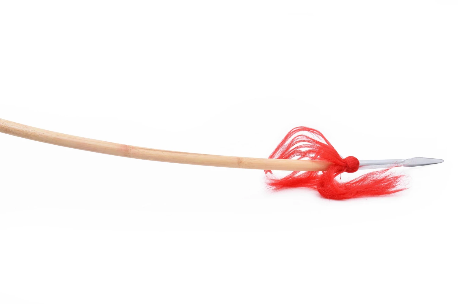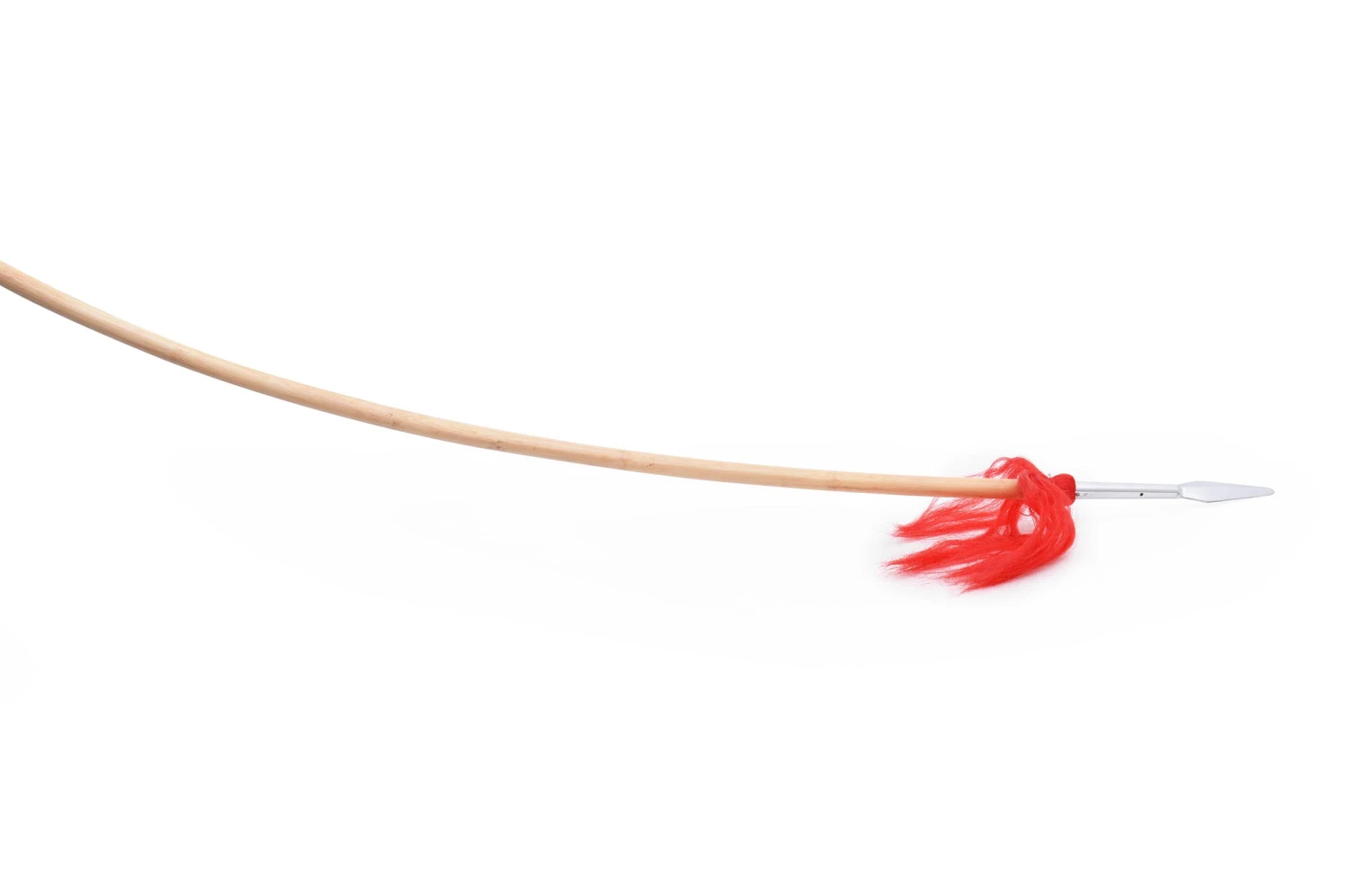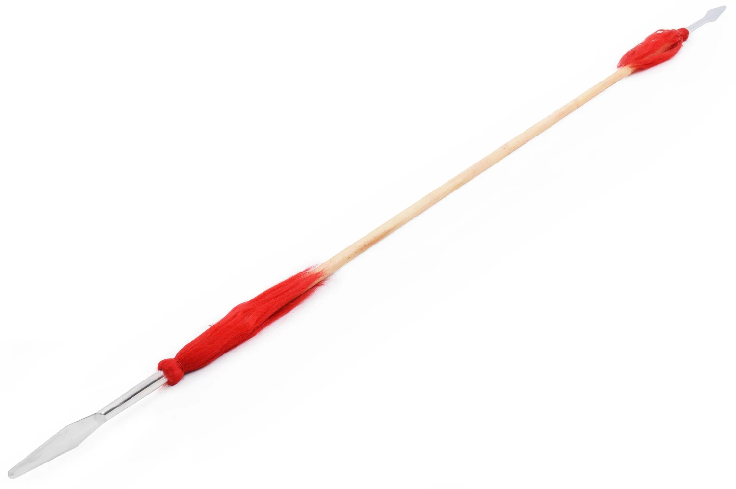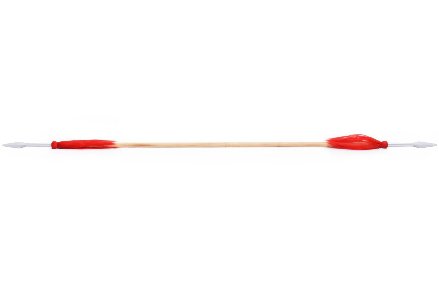 Lance avec deux pointes (une de chaque côté), chacune est ornée d’une décoration rouge. Le bâton de la lance est en rotin.