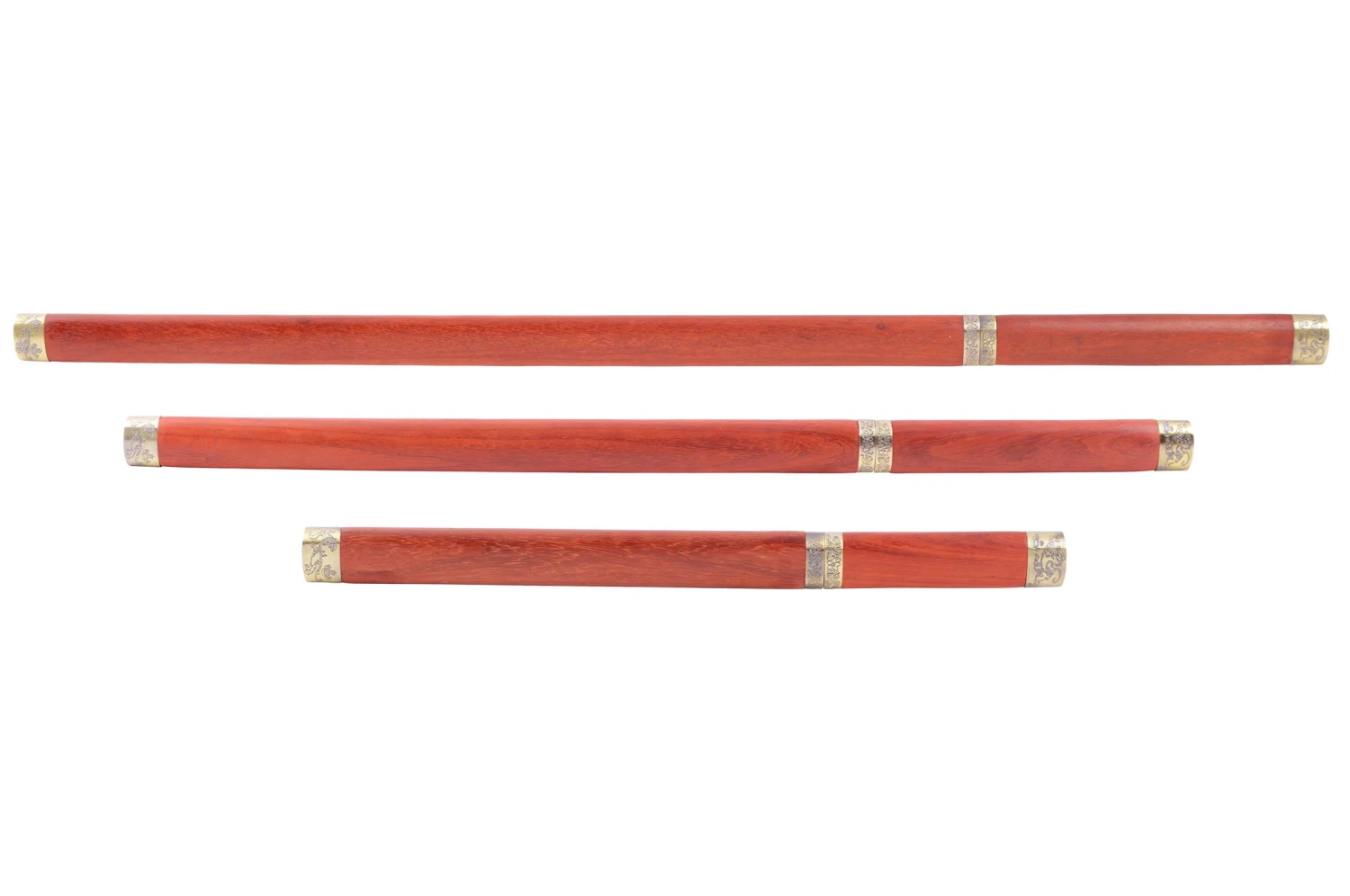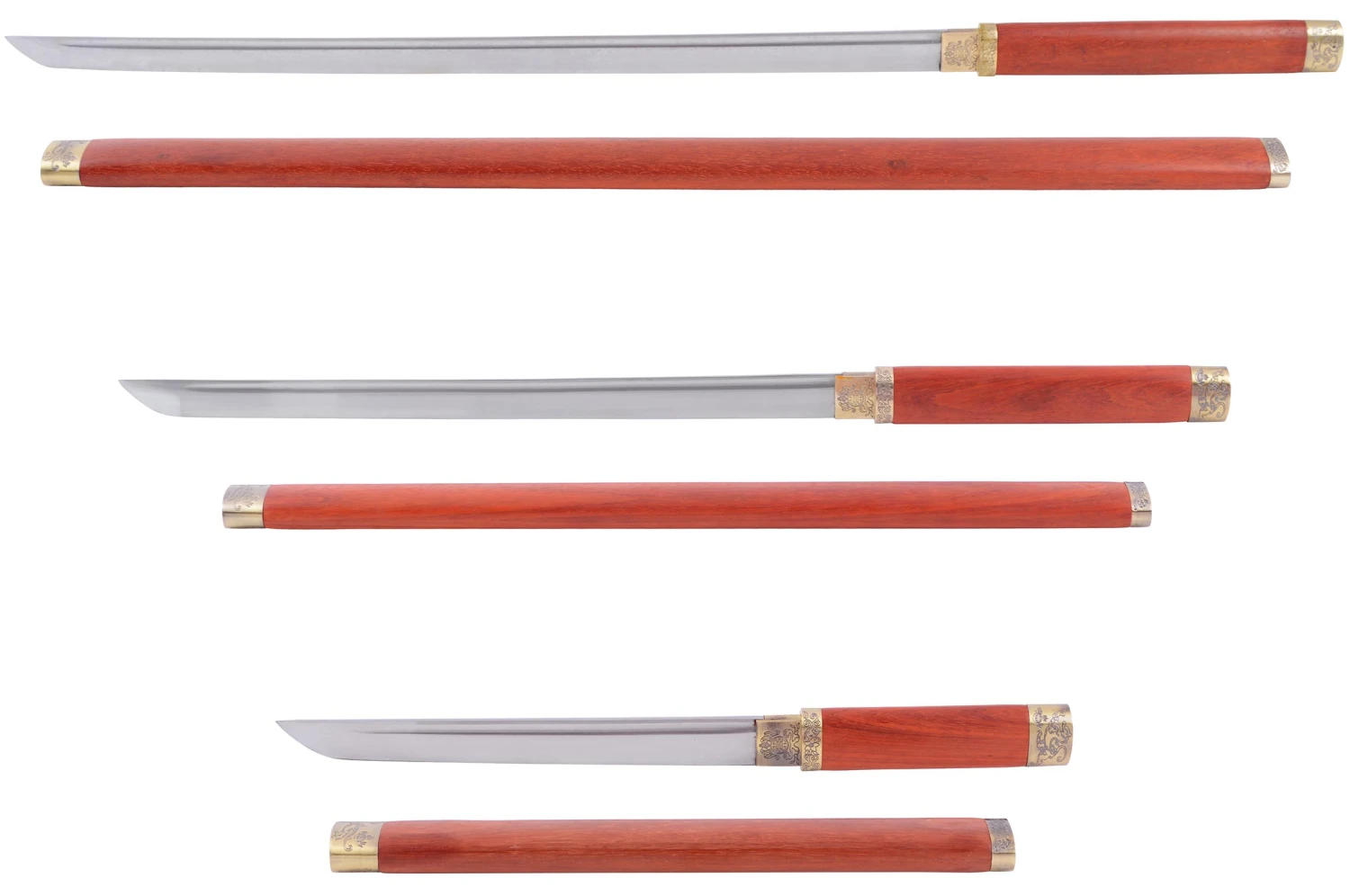 Ces trois Shirasayas possèdent des lames droites à gorges aiguisées en acier inox haute teneur en manganèse, des manches (Tsuka) et magnifiques fourreaux (Saya) en bois verni.