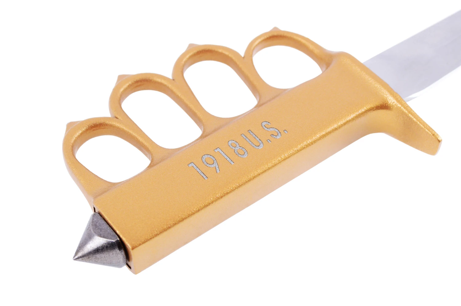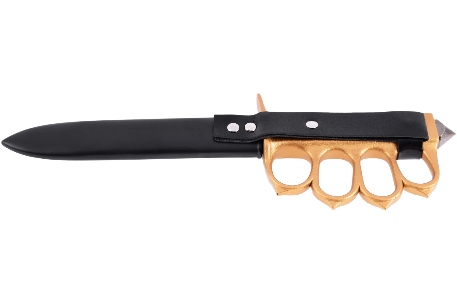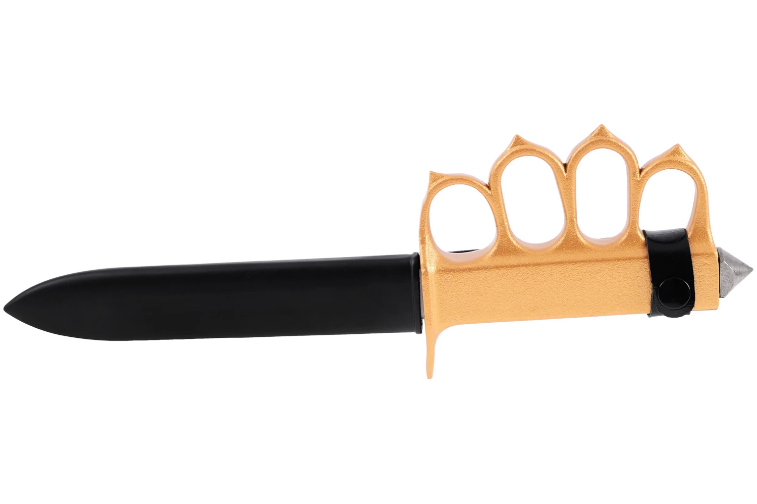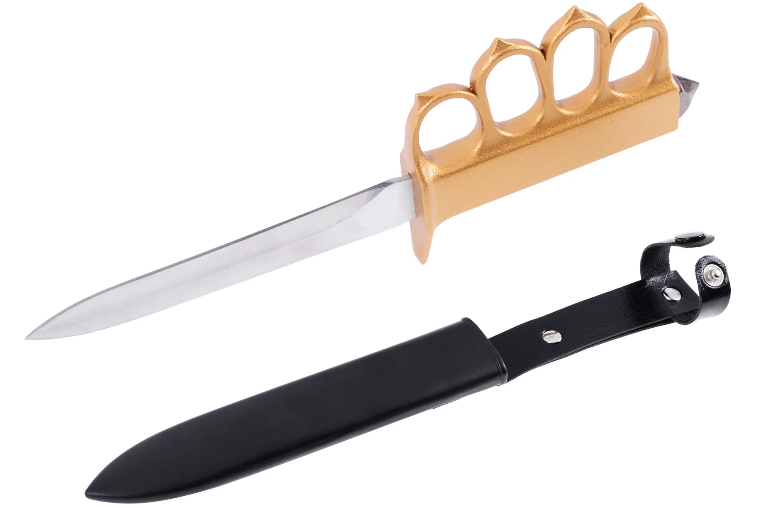 Poignard avec une lame en acier inoxydable de 15 cm et un manche Poing Américain en acier doré avec pointe en Acier Kubotan Brise vitre. Poignard vendu avec une gaine métallique avec attache en cuir.