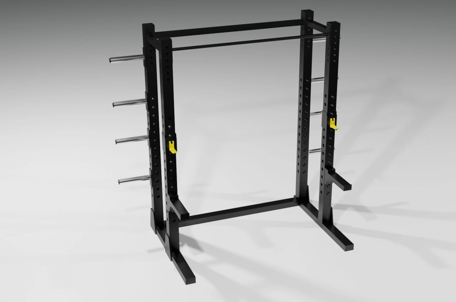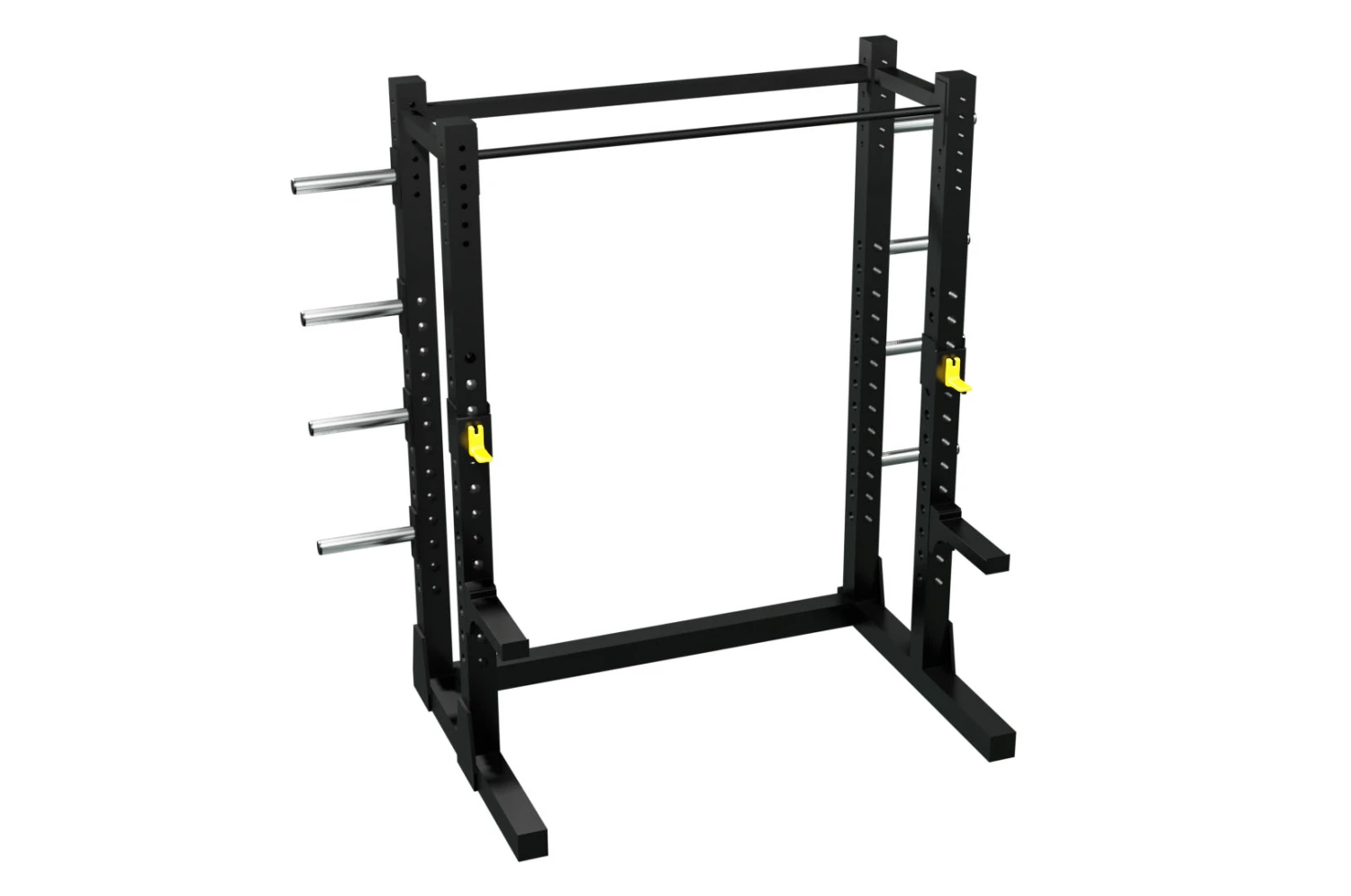 Equipé de barres de rangement pour poids (weight horn), et des bras pour reposer la barre (spotter arms).