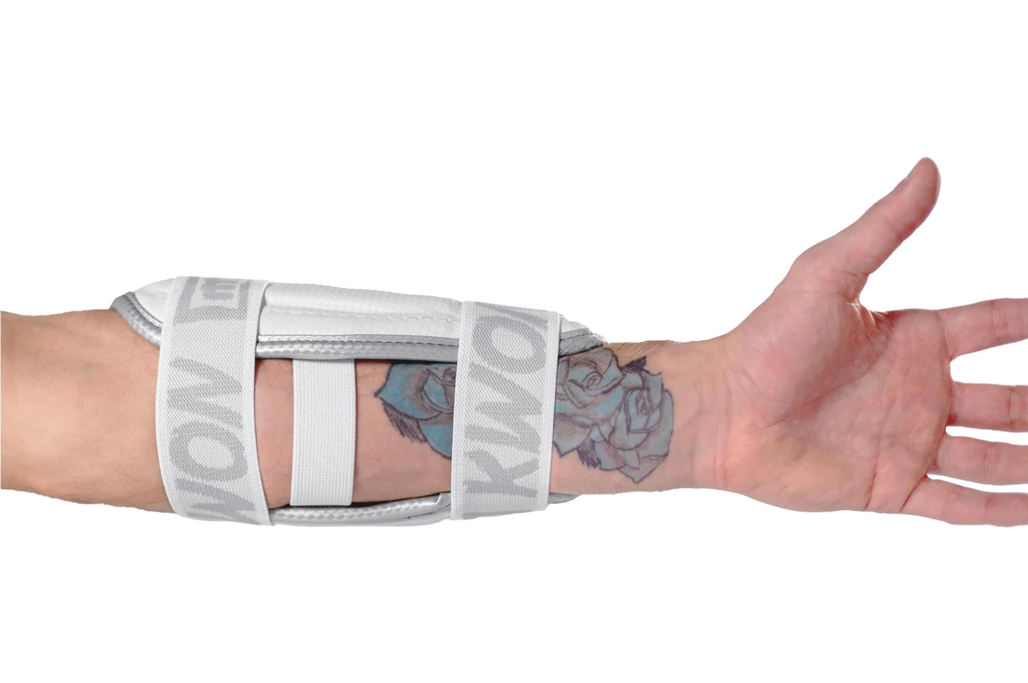 Le logo WTF et les fermetures velcro sont dans un ton argenté subtil, ce qui les rend moins visibles sous le dobok. La largeur de la protection a été augmentée de sorte qu’elle couvre désormais presque tout l’avant-bras et que pratiquement aucune partie de l’avant-bras ne reste découverte.