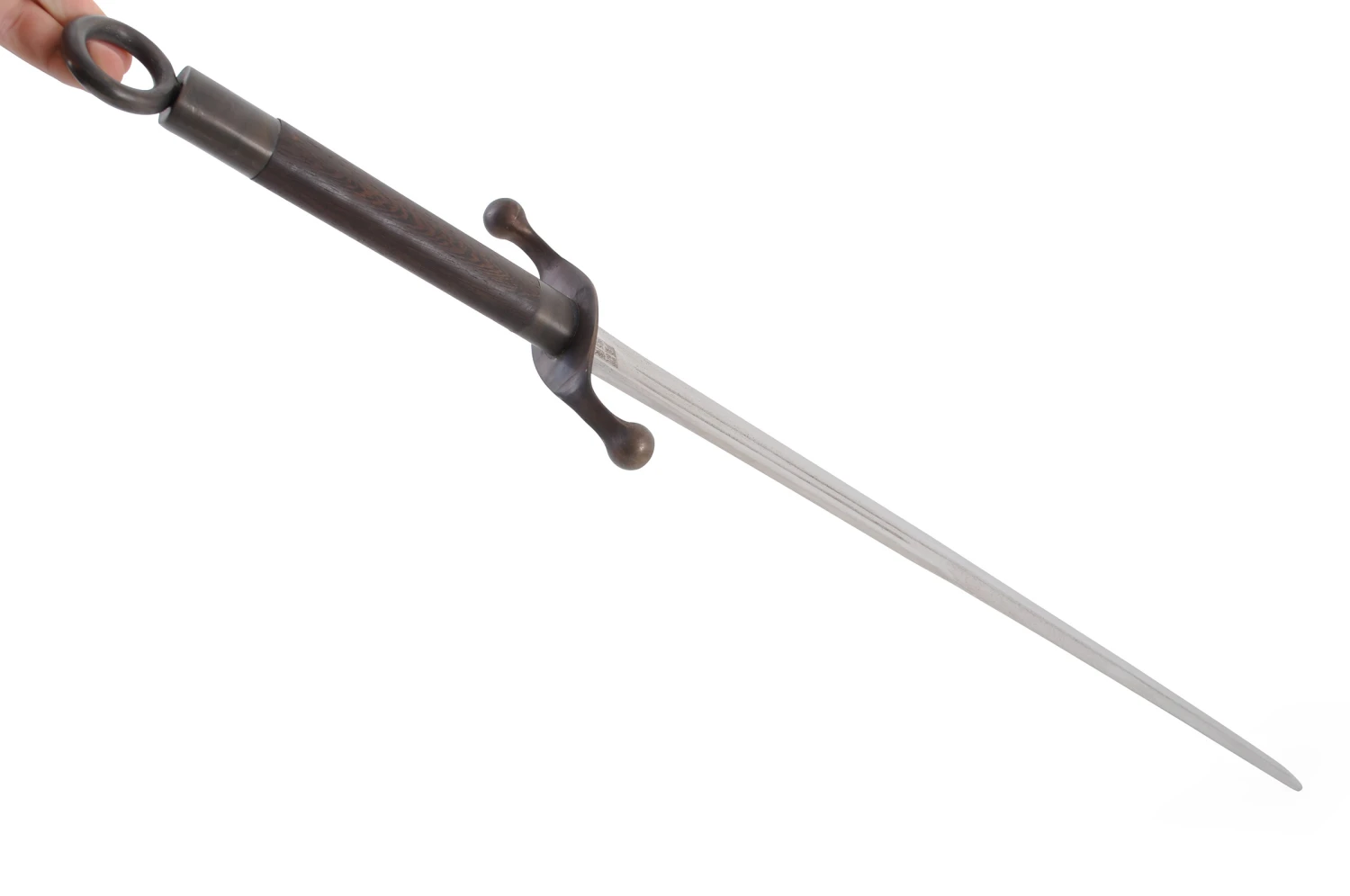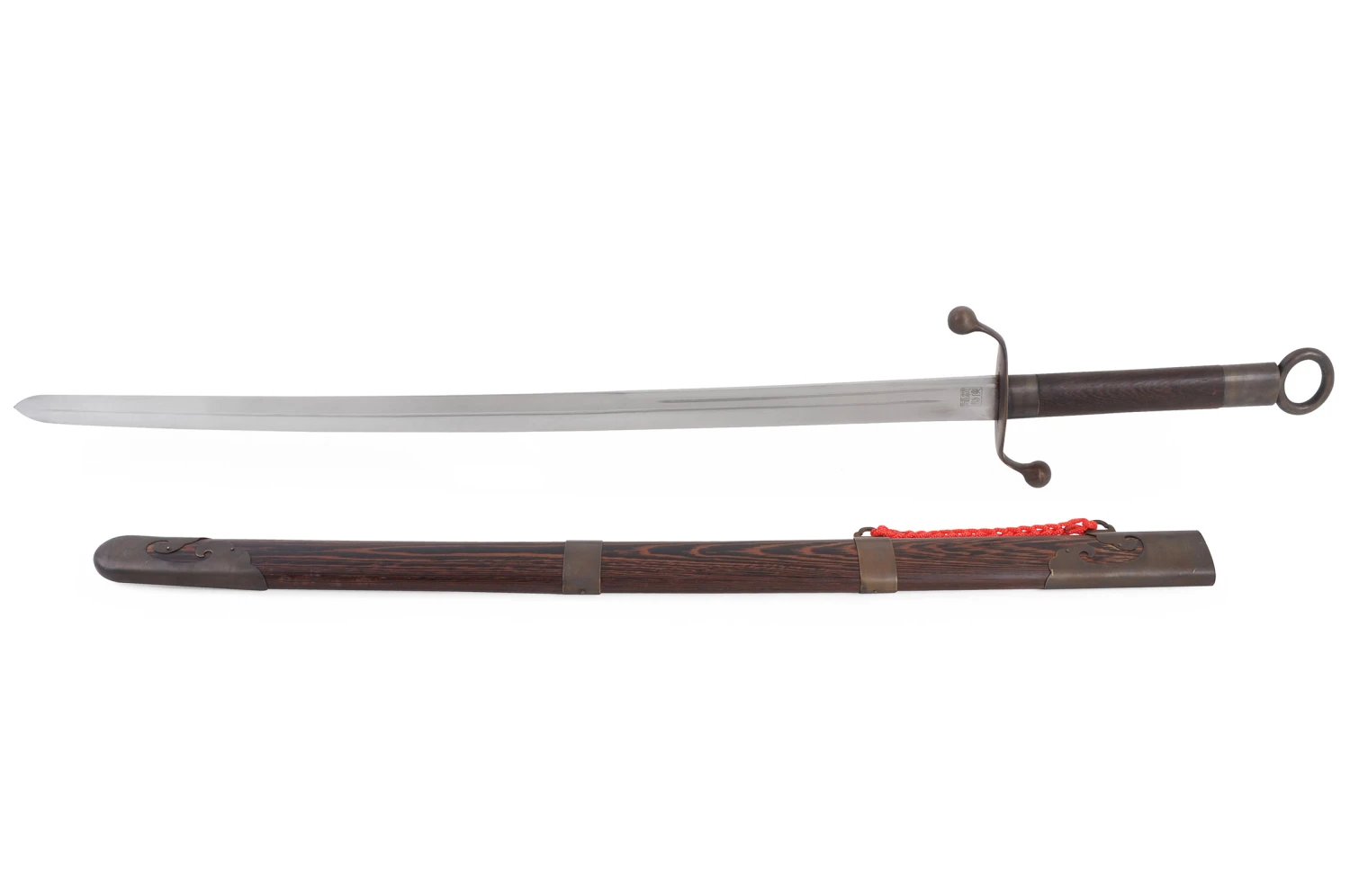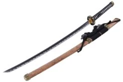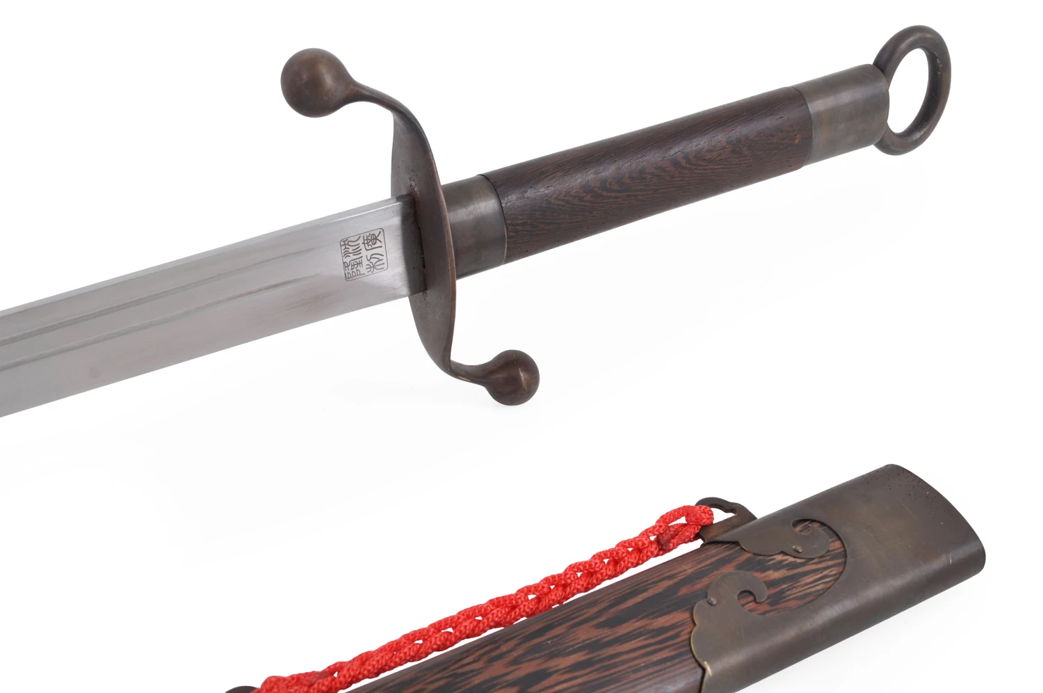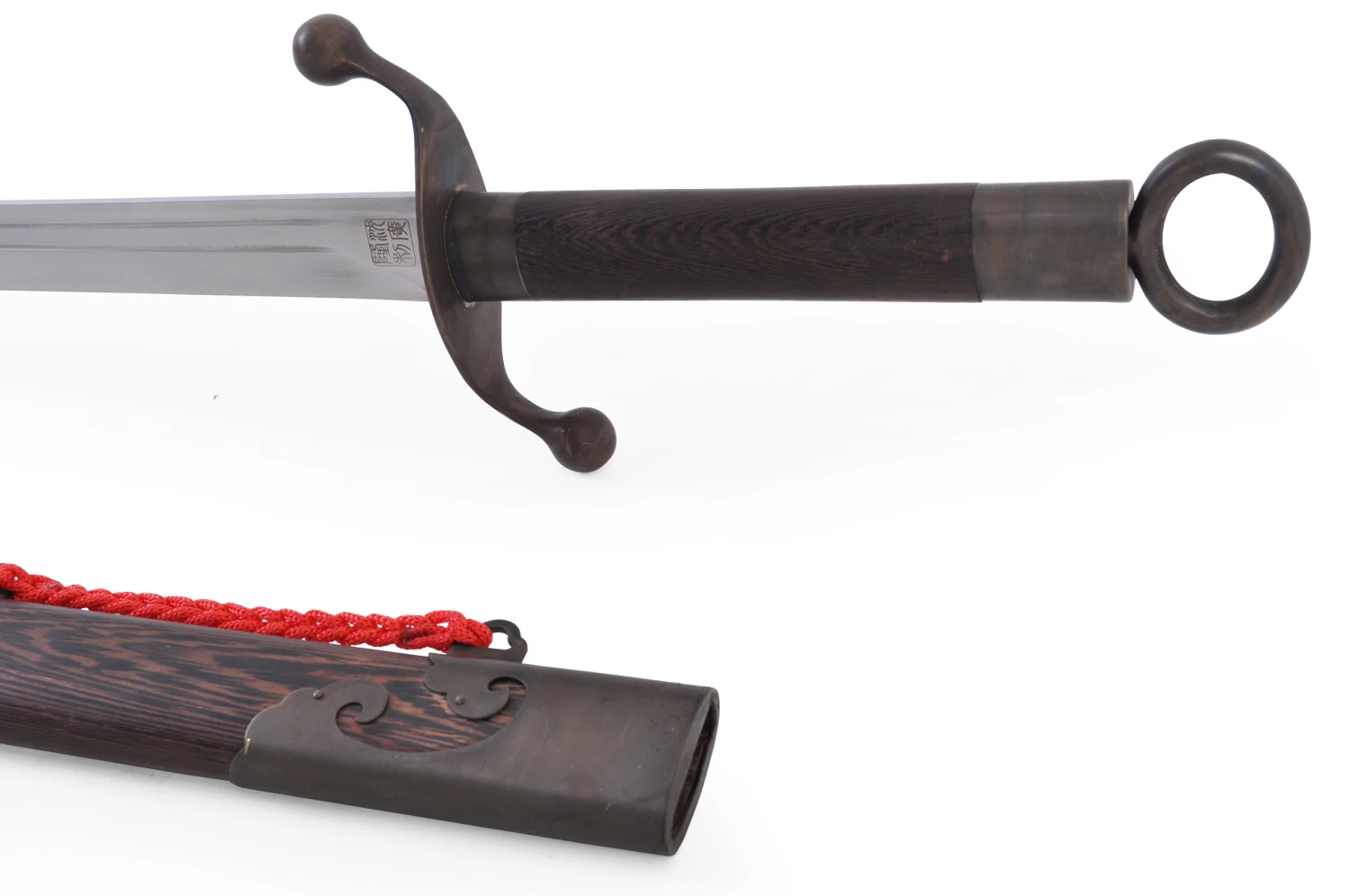Voici une une arme haut de gamme, forgée à la main de manière traditionnelle, la lame rigide est faite d’un alliage acier carbone et manganèse, les parties cuivrées et en bois sont recouvertes d’une patine noire. Réalisée dans les forges de Longquan. C’est un sabre de taiji style Yang.