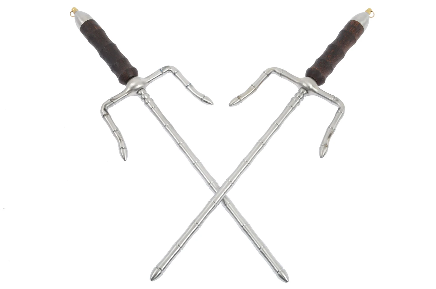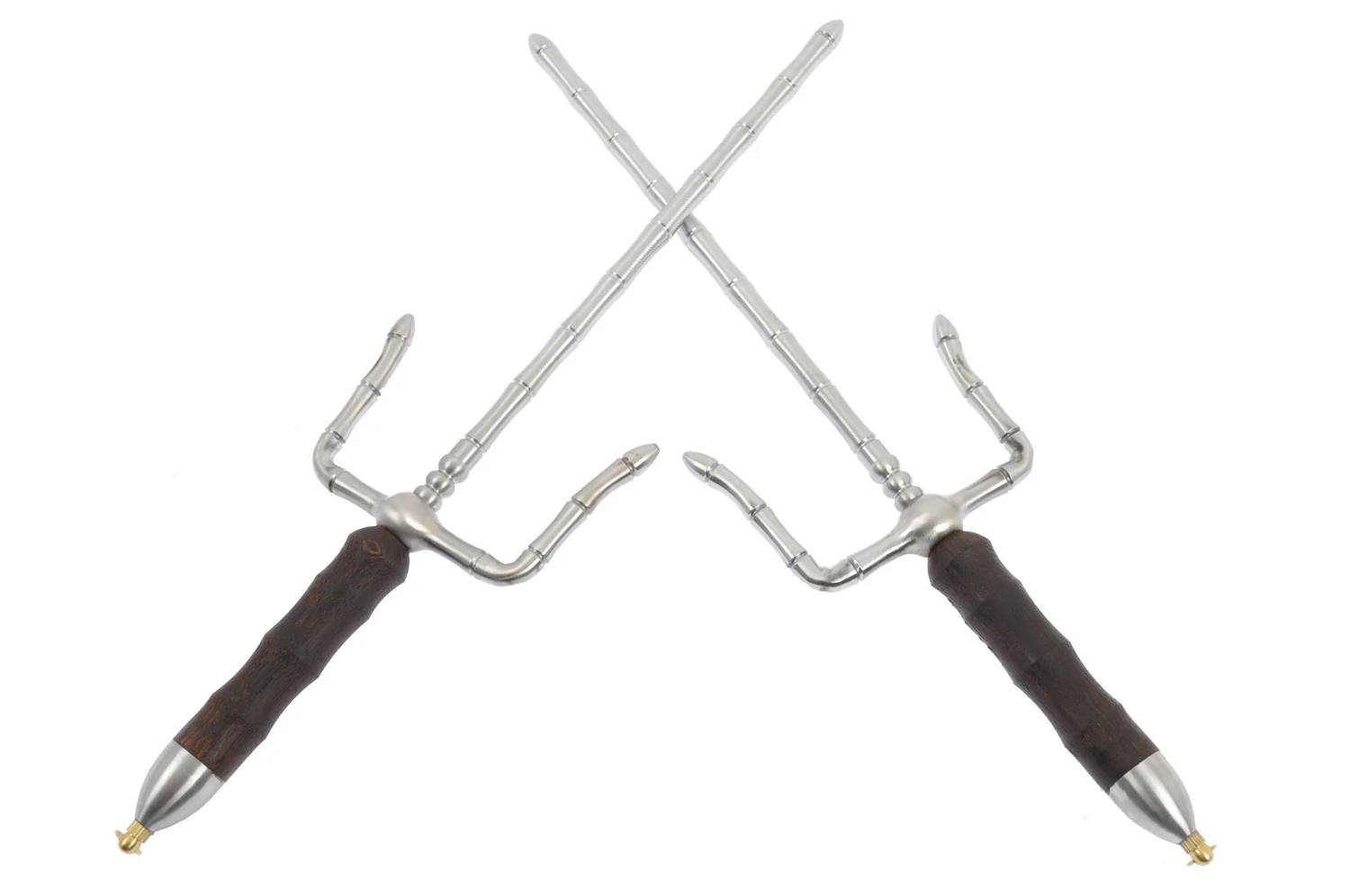 Cette paire de Sai est trés spéciale avec sa lame à section en forme de bambou (qui rappelle les lames des massues Shuang Jian). Arme trés traditionnelle et devenue rare, appelée aussi Gen.