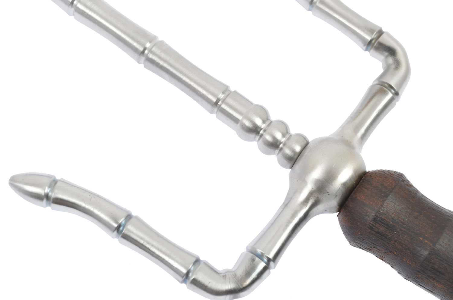 En acier inox, cette arme permet à la fois de défendre efficacement en bloquant les armes de l’adversaire, et d’attaquer avec une des trois pointes.